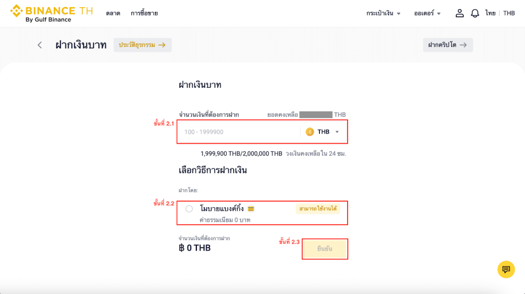 หมายเหตุ: จำนวนฝากขั้นต่ำ 100 บาทต่อครั้ง สูงสุด 2,000,000 บาทต่อครั้ง และมีวงเงินในการฝากเงินสูงสุด 2,000,000 บาทใน 24 ชั่วโมง (คุณสามารถยื่นคำขอเพื่อเพิ่มวงเงินในการฝากถอนเงินบาทต่อ 24 ชั่วโมงได้ โดยกรุณาติดต่อฝ่ายบริการลูกค้าผ่านช่องทางแชทที่ https://www.binance.th/en เพื่ออัปเกรดระดับการยืนยันตัวตนของคุณ)
