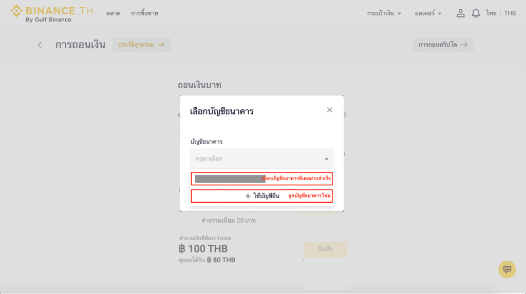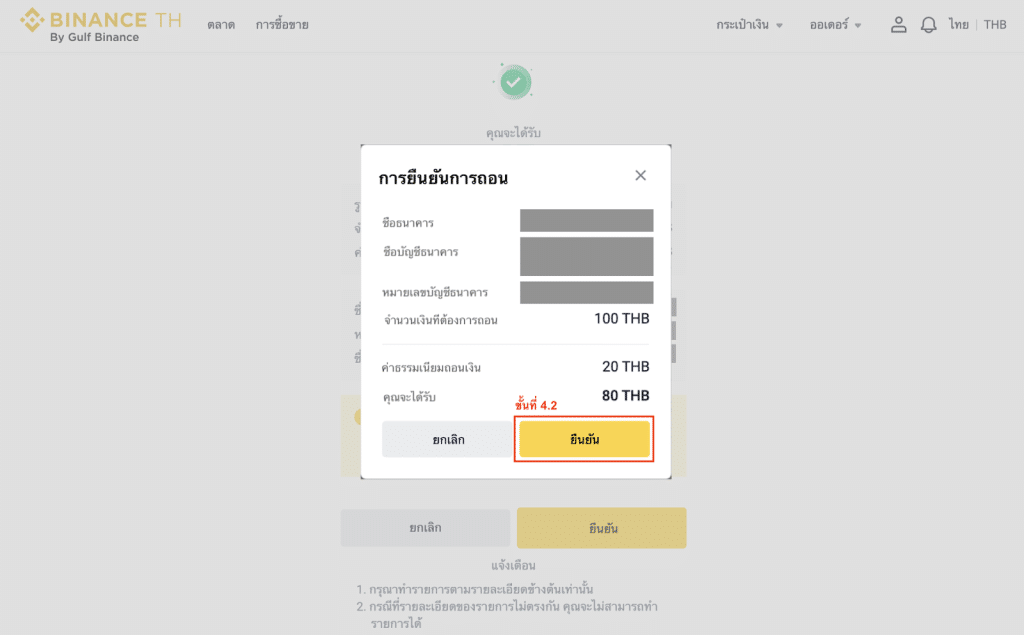 หมายเหตุ: จำนวนถอนขั้นต่ำ 100 บาทต่อครั้ง สูงสุด 2,000,000 บาทต่อครั้ง และมีวงเงินในการถอนเงินสูงสุด 2,000,000 บาทใน 24 ชั่วโมง (คุณสามารถยื่นคำขอเพื่อเพิ่มวงเงินในการฝากถอนเงินบาทต่อ 24 ชั่วโมงได้ โดยกรุณาติดต่อฝ่ายบริการลูกค้าผ่านช่องทางแชทที่ https://www.binance.th/en เพื่ออัปเกรดระดับการยืนยันตัวตนของคุณ)