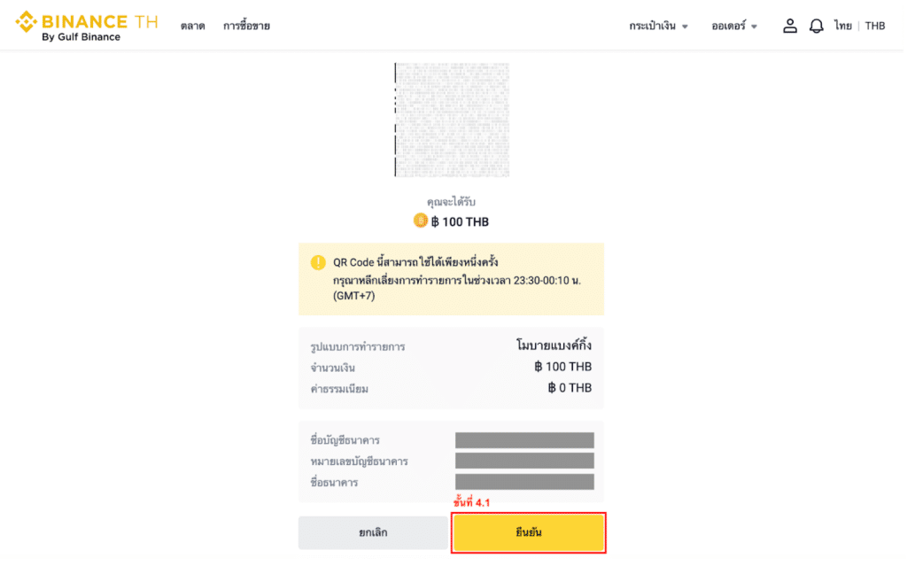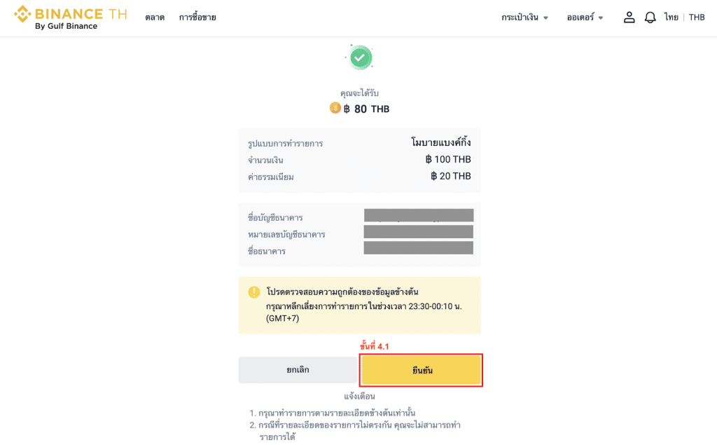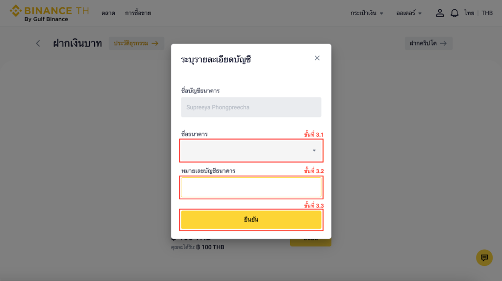 หมายเหตุ:ชื่อ-นามสกุลในบัญชี Binance TH ของคุณต้องตรงกับชื่อ-นามสกุลของบัญชีธนาคารที่คุณเลือก คุณจะได้รับเงินในบัญชี Binance TH ภายใน 1 นาทีถึง 24 ชั่วโมง