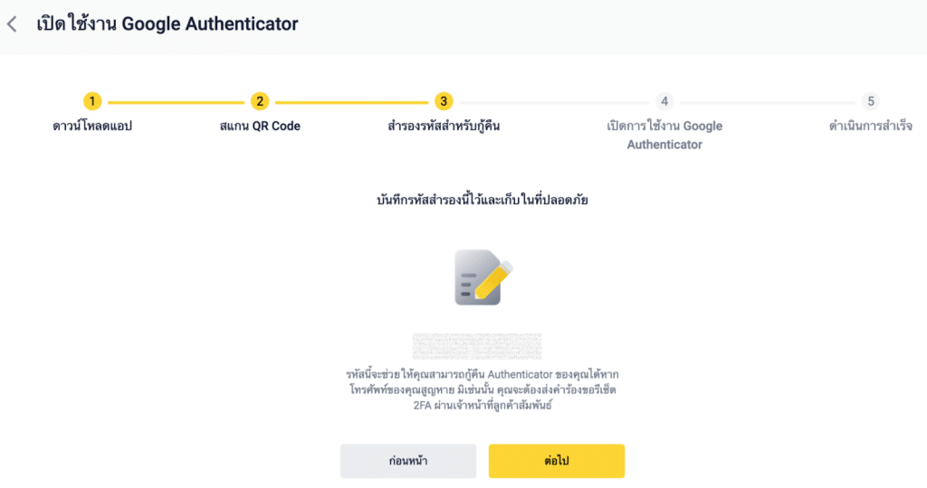 หมายเหตุสำคัญ: บันทึกรหัสลงบนกระดาษ การดำเนินการนี้จะช่วยให้คุณสามารถกู้คืน Google Authenticator ได้หากคุณทำโทรศัพท์หาย คลิก [ถัดไป] เพื่อดำเนินการต่อ