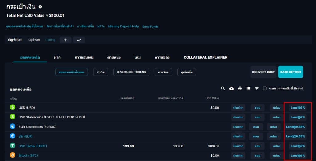 ซึ่งถ้าเป็นจุดประสงค์ของการฝากเงิน (Lending) ในแพลตฟอร์มกระดานเทรดคริปโตทั่วไปอย่าง Binance หรือ FTX นั้น จะเป็นการฝากเงิน เพื่อที่จะให้ระบบสามารถนำเงินส่วนนี้ไปใช้งานต่อในการเทรดประเภท Margin Trading หรือ Leverage Trading ต่อได้