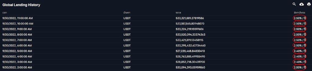 หากเลื่อนลงมาด้านล่างอีก ก็จะเจอประวัติ 7 วันย้อนหลังว่าดอกเบี้ยจากการฝากเหรียญ USDT เป็นเท่าไรบ้าง ก็จะเห็นเลยว่าบางช่วงเวลาก็ได้เพียง 2% ต่อปี แต่ในช่วงพีคๆก็ได้มากถึง 4% ต่อปี เป็นต้น