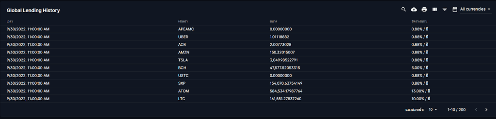 ในหน้า Dashboard นี้ ก็จะแสดงรายละเอียดของเหรียญต่างๆที่ FTX เปิดให้เราฝากเงิน/ปล่อยกู้ได้ โดยสังเกตได้จากสี่เหลี่ยมสีแดงที่เป็นตัวเลข Previous Lending Rate กับ Estimated Lending Rate สำหรับ Previous Lending Rate ก็คืออัตราดอกเบี้ยที่ทางแพลตฟอร์มจ่ายให้กับคนที่ฝากเงิน/ปล่อยกู้เหรียญนั้นๆในชั่วโมงที่แล้ว และ Estimated Lending Rate คืออัตราดอกเบี้ยประมาณการโดยคำนวนจากคนที่เข้ามากู้ในช่วงระหว่าง 1 ชั่วโมงที่ผ่านมา เป็นต้น