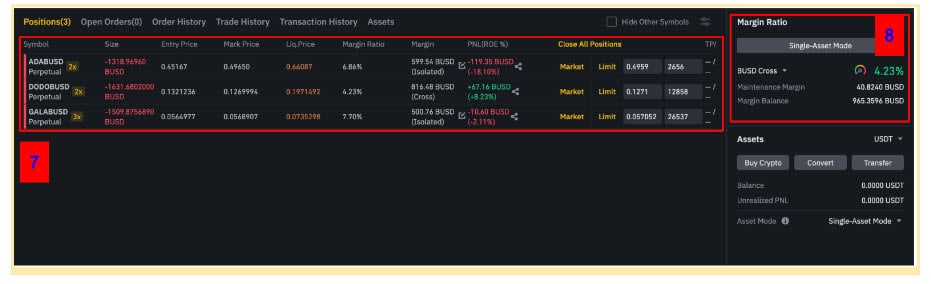 ในข้างล่างจะแสดงถึงสถานะ Position ของคุณ ได้แก่ ราคาที่เราทำการซื้อสัญญา , ราคาของสัญญาในตลาดปัจจุบัน , Margin Ratio , และ PNL (ผลกำไรหรือขาดทุนในแต่ละ Position)