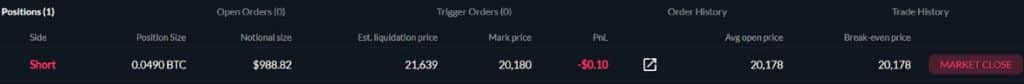 - Break-even Price : ราคาเฉลี่ยของ BTC หากราคาลงไปแตะ $20,178 เราจะคืนทุน Position ของเรา (เนื่องจากเงินส่วนนึงถูกนำไปหักค่าธรรมเนียมการเทรด)
