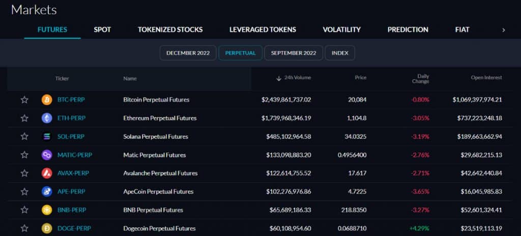 สัญญา Future บน FTX นั้นมีหลากหลายเหรียญมาก ไม่ว่าจะเป็น BTC, ETH, SOL, AVAX, MATIC, APE, BNB และเหรียญอื่นๆอีกมากมาย นอกจาก Perpetual Future แล้ว ทาง FTX ก็ยังมีสัญญา Future ประเภทอื่นๆด้วย ได้แก่ December 2022 (เช่น BTC-1230, ETH-1230) ก็คือสัญญา Future ที่หมดอายุในวันที่ 30 เดือนธันวาคม 2022, September 2022 (เช่น BTC-0930, ETH-0930) คือสัญญา Future ที่หมดอายุในวีนที่ 30 เดือนกันยายน 2022 และยังมีเทรด Index ของแต่ละ Sector อีกด้วย ไม่ว่าจะเป็น ALT-PREP (Altcoin Index), DEFI-PREP (DeFi Index) และ EXCH-PREP (Exchange Token Index) เป็นต้น