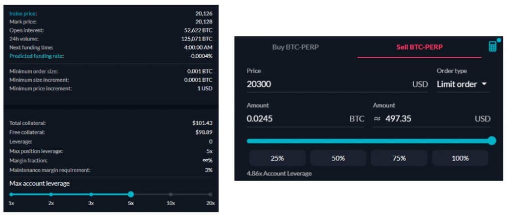 - Max Position Leverage : ใช้ Leverage ที่ 5 เท่าของเงินทุน และจำนวนเท่าของ Leverage ภายใน FTX จะสามารถใช้ได้ตั้งแต่ 1x 2x 3x 5x 10x และสูงสุดที่ 20x ซึ่งตามภาพหากเรามีหลักประกัน $100 แล้วใช้ Leverage ที่ 5x เท่ากับว่าเราจะได้กำไรจากการเปิด Position มากที่สุดคือ $500 (ภาพขวาที่โชว์ตัวเลข $497.35 เนื่องจากเป็นกำไรที่เป็นไปได้ทั้งหมดหลังหักค่าธรรมเนียม)