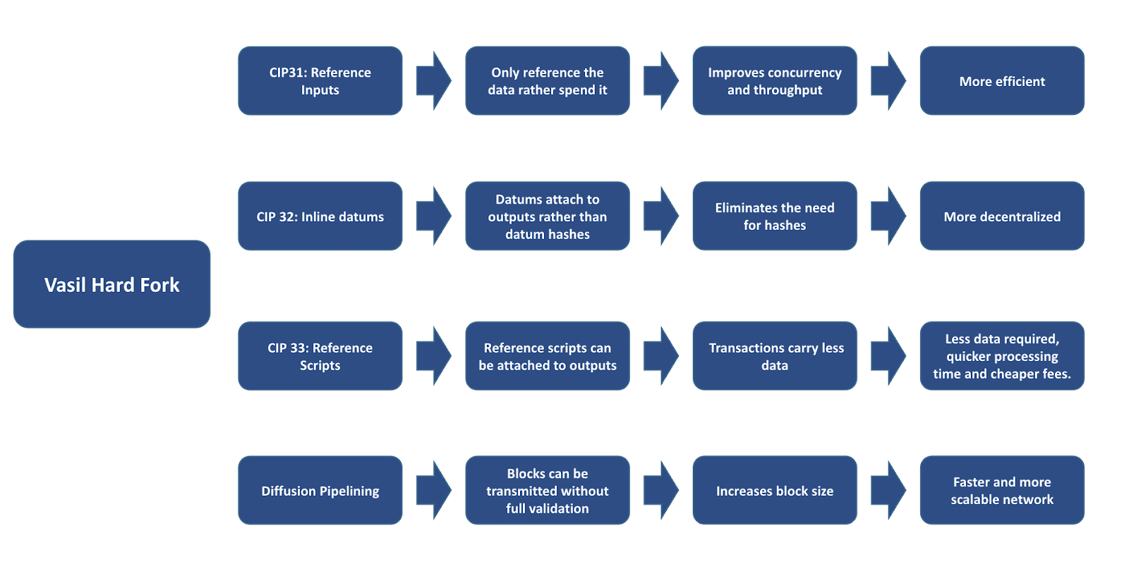 โดยสรุป การอัปเกรด Vasil Hard Fork มีเป้าหมายเพื่อให้ Cardano Blockchain ทำอะไรได้มากขึ้นและดีขึ้น โดยเป็นการปรับปรุงความเร็วเครือข่ายและความสามารถในการขยายขนาดได้อย่างมีนัยสำคัญ ทำให้รองรับ DApps ที่ซับซ้อนมากขึ้นพร้อมประสบการณ์ผู้ใช้ที่ดีขึ้น นอกจากนี้ ยังสร้างแพลตฟอร์มสัญญาอัจฉริยะ (Smart Contract Platform) อย่างแท้จริง เปิดพื้นที่การเล่าเรื่องสำหรับ "แพลตฟอร์มสัญญาอัจฉริยะ" ของครึ่งปีหลังของ Cardano และวางรากฐานสำหรับการเติบโตของ DApps ใหม่ ผู้ใช้ใหม่ รวมไปถึงระบบนิเวศ TVL ของ Cardano ด้วย