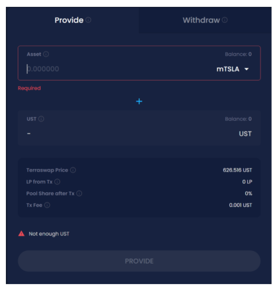 - นำเหรียญหุ้นและ UST มาวาง ในอัตราส่วน 50:50 ไว้ในหน้า Pool เราจะได้เหรียญ LP ของ pool หุ้นนั้นๆมา