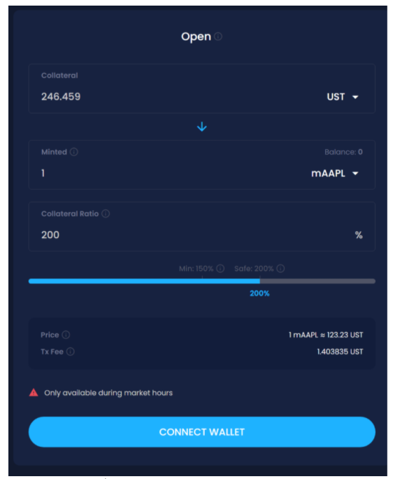 - ในกรณีคุณต้องการความเสี่ยงที่ต่ำมากคุณอาจจะทำการ Mint หุ้นออกมาแต่คุณก็ต้องเสีย Stablecoin ไปส่วนหนึ่งในการ Mint (เพราะตอนเอามาแลกคืนจะไม่ต้องกังวลเวลาราคาหุ้นผันผวน)