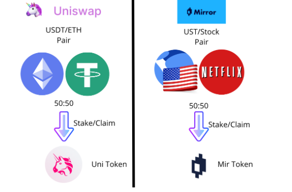 Mirrot Protocol นั้นเป็นแพลทฟอร์มที่เราสามารถวาง Liquidity แบบ 50:50 เหมือนกับ Uniswap และหลังจากนั้นก็นำเหรียญ LP ไป Stake เพื่อรับเหรียญ Mirr ที่เป็น Governance Token เพื่อเอามาขายเพื่อรับผลตอบแทนได้