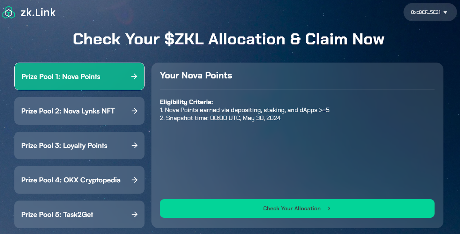 ผู้ใช้งานสามารถเช็คได้ที่ : https://zklink.io/novadrop/check-eligibility โดยเชื่อมกระเป๋าที่เคยใช้งานหากได้รับ airdrop ให้ดำเนินการเชื่อม social network ช่องทางต่างๆเพื่อเช็คคะแนน และเช็คกิจกรรมทั้งหมด 5กิจกรรมโดย กดที่ Check Your Allocation ให้ครบทั้ง 5 กิจกรรม และสามารถกดเคลมได้ทันที