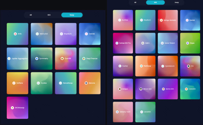 ปัจจุบันมี Project สำหรับทำการ Swap สินทรัพย์ ที่อยู่ในการดูแลของ Serum อยู่ 13 projects และ มี Decentralized Exchange อยู่ 14 projects