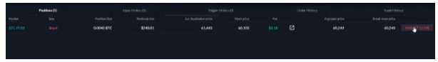 ซึ่งจะแสดงรายละเอียดของคู่สัญญาที่เราเปิดอยู่ ว่าเราเปิดสัญญาที่คู่ไหนมีขนาด position เท่าไหร่ และจะบอกราคาที่จะโดน liquidate ส่วน PnLจะเป็นจำนวนที่บอกว่าเรากำไรหรือขาดทุนอยู่เท่าไหร่ และผู้ใช้งานสามารถเลือกปิด position ได้ตลอดเวลา