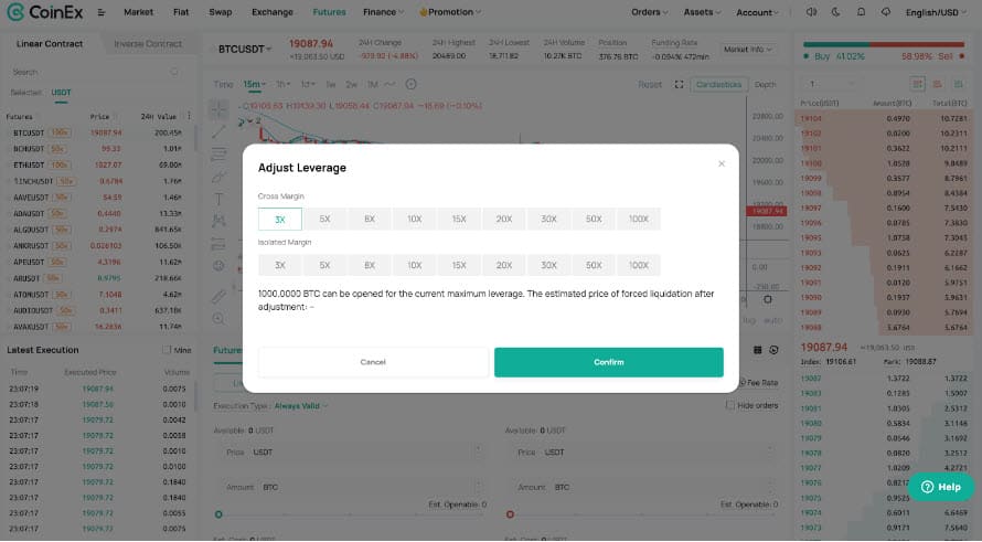 ซึ่งใน CoinEx จะอนุญาติให้ผู้ใช้งาน leverage ได้สูงที่สุดถึง 100x หรือ 100 เท่าของจำนวนเงินต้น หมายถวามว่าหากเรามีเงินจำนวน 1,000 ดอลลาร์ เราจะสามาถเปิด Position ของสินทรัพย์ที่เราต้องการเทรดได้ถึง 100,000 ดอลลาร์นั่นเอง