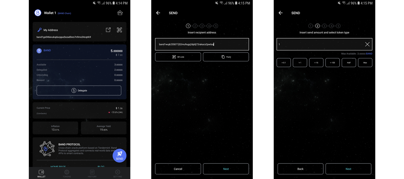 กดปุ่ม “Send” (วงกลมสีน้ำเงินพร้อมไอคอนจรวด) >> ป้อนที่อยู่สำหรับใช้รับเหรียญ >> ใส่จำนวน Band ที่จะถอน >> ใส่ memo (ไม่บังคับ) >> ใส่ transaction fee >> กด Confirm และใส่ PIN