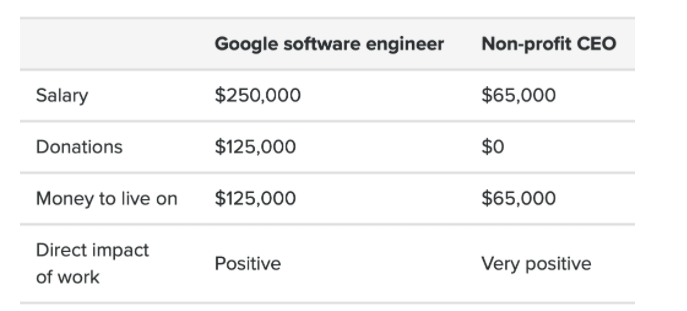 จากตารางนี้ จะเห็นได้ว่าหลักการ Earn to Give นั้นมีประโยชน์มากแค่ไหน ต่อทั้งตัวผู้ให้ และ ผู้รับซึ่ง แซมได้บริจาคให้กับองคกรณ์การกุศลแนว “High - Impact Charities” ซึ่งจะนำเงินที่ได้รับบริจาคไปทำให้เกิดอิมแพคต่อสังคมมากที่สุด โดยด้านที่แซมสนใจที่สุดคือการพัฒนาความเป็นอยู่ของมนุษย์ในระยะยาว ซึ่งในปัจจุบัน แซมได้ตั้ง 1% จากกำไรสุทธิของค่าธรรมเนียมใน FTX เพื่อบริจาค และได้บริจาคไปแล้วกว่า $3 ล้านเลยทีเดียว โดยสำหรับใครที่สนใจในเรื่องนี้สามารถเข้าไปดูเพิ่มเติมได้ที่ https://80000hours.org