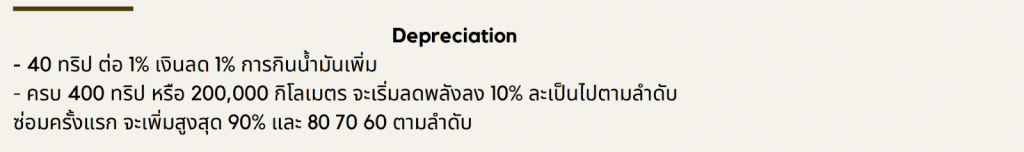 แต่รถจะมีรายละเอียดเพิ่มเติมเล็กน้อยซึ่งก็คือ Depreciation หรือการเสื่อมของรถ โดยการเสื่อมจะลด 10% ทุกๆ 400 ทริป หรือ 200,000 กิโลเมตร ซึ่งการซ่อมในแต่ละครั้งจะไม่สามารถซ่อมขึ้นมาเต็ม 100% ได้แต่จะลดลงเรื่อยๆ ครั้งละ 10% ต่อการซ่อมแต่ละครั้ง