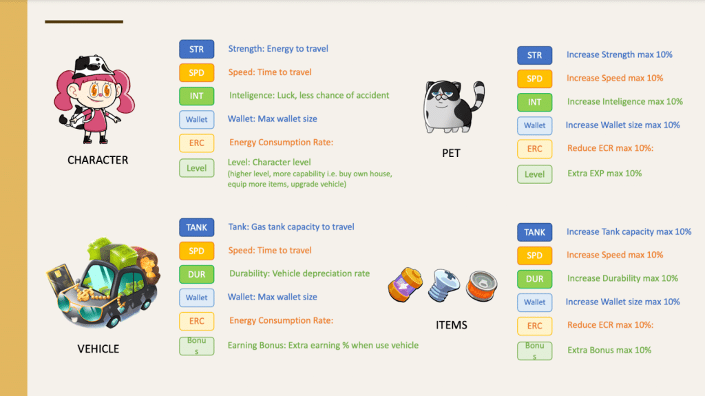ค่าสถานะหลักๆ ที่แตกต่างกันอย่างมากก็คือ Speed (SPD) และ Wallet ซึ่งหมายความว่าการทำภารกิจโดยไม่มีรถ จะได้รางวัลสูงสุดเพียง 3 เหรียญต่อวันและจะใช้เวลาในการเดินทางมากกว่า แต่ถ้าใช้รถควบคู่ไปด้วยจะเร็วกว่าเดินอย่างมากและจะเพิ่มรางวัลสูงสุดต่อวันอีก 15 เหรียญ ซึ่งรวมแล้วได้ 18 ต่อวัน