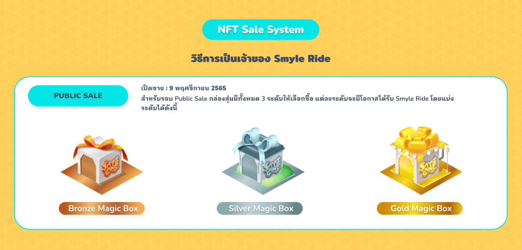 - Bronze Magic Box : ราคา 0.054 ETH จำนวน 6,000 กล่อง ซึ่งจะสามารถสุ่มได้ Smyle Ride ระดับ Common - Legendary