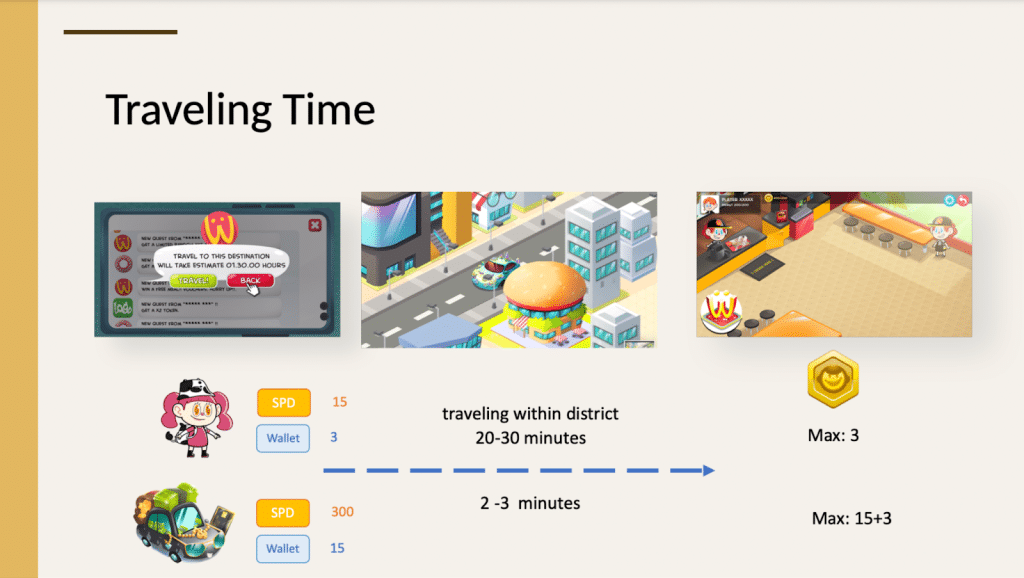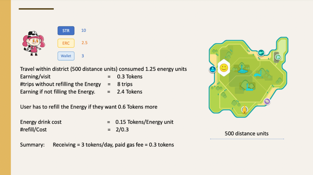 ซึ่งตัวละครนี้มี STR ที่ 10 ทำให้สามารถเดินทางได้เพียง 8 ทริปเท่านั้น และเหรียญที่ได้รับจะได้ 0.3 Token ต่อครั้ง ทำให้เหรียญที่ได้รับจะอยู่ที่ 2.4 Token แต่จำนวนสูงสุดที่สามารถรับได้ต่อวันคือ 3 Token