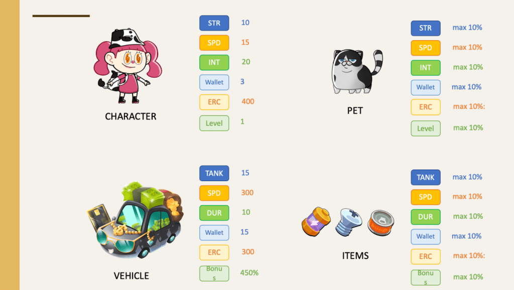 SmyleLand จะมีส่วนประกอบหลักๆ สำหรับผู้เล่นอยู่ 4 อย่างคือ Character, Vehicle, Pet และ Items โดย Character และ Vehicle จะเป็นส่วนคำคัญที่สุดสำหรับ SmyleLand ส่วน Pet และ Item จะเป็นส่วนเสริมที่ช่วยเพิ่ม Stat ให้กับ Character และ Vehicle ซึ่ง Stat แต่ละอย่างมีความหมายดังนี้