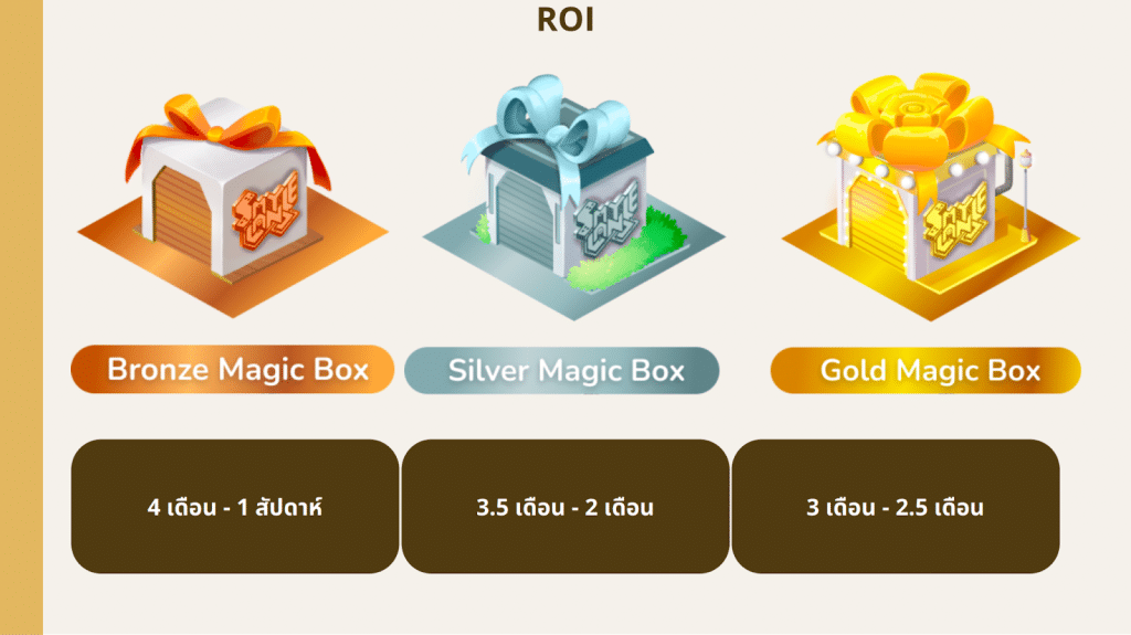 **ระยะเวลาการคืนทุนอาจมีการเปลี่ยนแปลงได้ตามเทคนิคการเล่นและราคาเหรียญ**