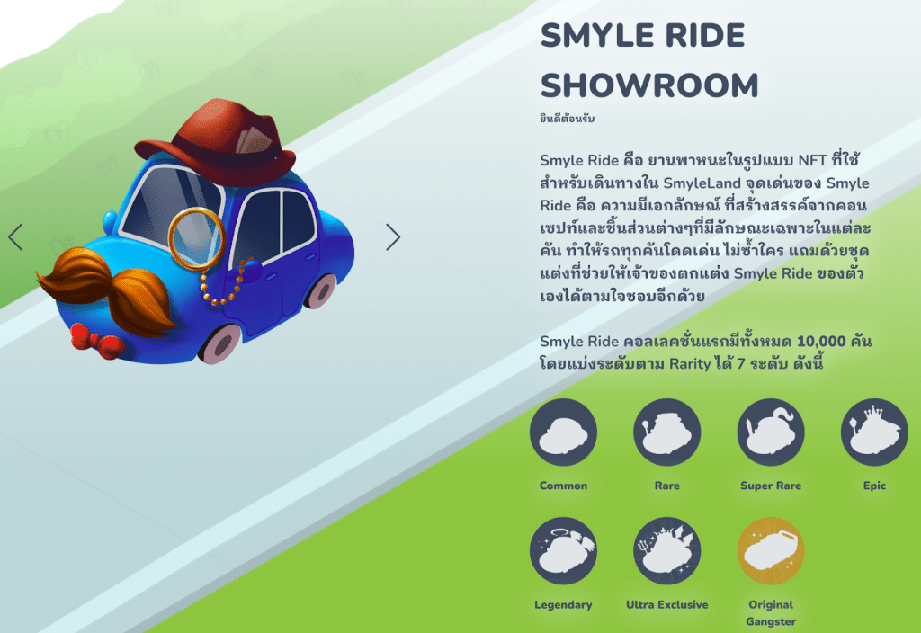 NFT ของ SmyleLand ที่พูดถึงนี้ก็คือ “Smyle Ride” ที่เป็นยานพาหนะที่มีไว้ใช้สําหรับเดินทางใน SmyleLand ที่จะช่วยทำให้ผู้เล่นสามารถเดินทางไปถึงจุดหมายได้รวดเร็วขึ้น