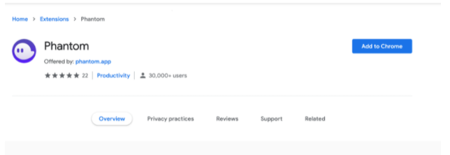 - Add Extension ของ Phantom ได้โดยกดปุ่ม Add to Chrome ที่ลิ้งก์นี้ https://chrome.google.com/webstore/detail/phantom/bfnaelmomeimhlpmgjnjophhpkkoljpa