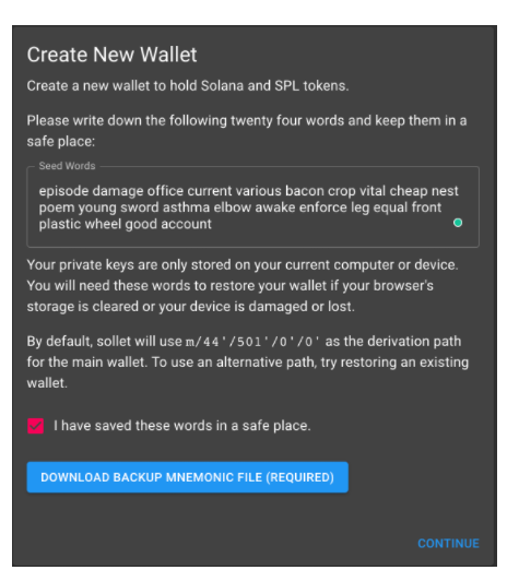 - เข้าไปที่ Sollet.io จากนั้นจะมี Seeds ชุด 24 คำ อย่าลืมจดรักษา Seeds กันด้วยนะ จากนั้นกด Download Backup Mnemonic File ซึ่งทาง Sollet จำเป็นให้เรากดก่อนไปขึ้นต่อไป