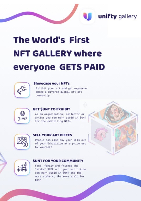 Unifty Gallery มีแนวคิดคือการสร้างแกลเลอรีศิลปะบนโลกดิจิทัลจากเดิมที่เป็นแกลเลอรีศิลปะแบบกายภาพ แกลเลอรี่แบบดั้งเดิมมีข้อเสียที่เห็นได้ชัดคือให้การคุ้มครองหรือรับประกันรายได้ของศิลปินน้อยมากในขณะที่ตัวศิลปินเองก็มีค่าใช้จ่ายที่ต้องเสีย และการจัดงานนิทรรศการแบบเดิมๆนั้นยังเรียกเก็บค่าคอมมิชชั่นจากศิลปินสูงถึง 50% แต่ Unifty ไม่เพียงแค่เปลี่ยนรูปแบบของการแสดงผลงานศิลปะเป็นแบบดิจิทัลเท่านั้นแต่ยังให้ความสำคัญกับการสร้างรายได้จากงานศิลปะแก่ผู้สร้างและผู้รับชมรวมถึงยังเพิ่มคุณค่าของงานศิลปะที่นำมาแสดงให้มากขึ้น