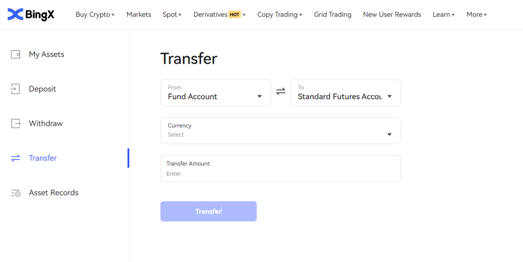 ก่อนอื่นต้อง Transfer Token จาก Fund Account ไปที่ Standard Futures Account, กดรูปกระเป๋ามุมบนขวาแล้วเลือก Transfer จากนั้นเลือกเหรียญ และจำนวนที่ต้องการแล้วกด Transfer