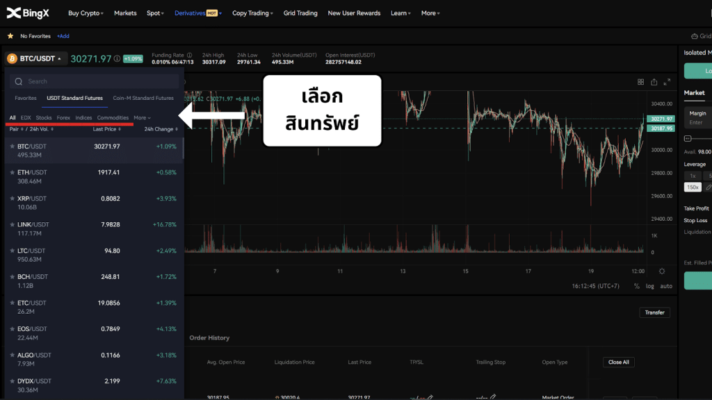 สามารถเลือกสินทรัพย์ที่ต้องการเทรดได้ในหน้า Standard Futures และที่ https://bingx.com/en-us/market/futures/