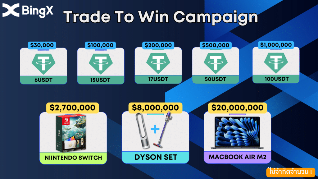 ของรางวัลมีเงินทดลองเทรด USDT, Nintendo Switch Zelda Edition, ชุดเครื่องฟอกอากาศและเครื่องดูดฝุ่น Dyson และ MacBook Air 15” สเปคจัดเต็ม มูลค่ารวมมากกว่า 100,000 บาท