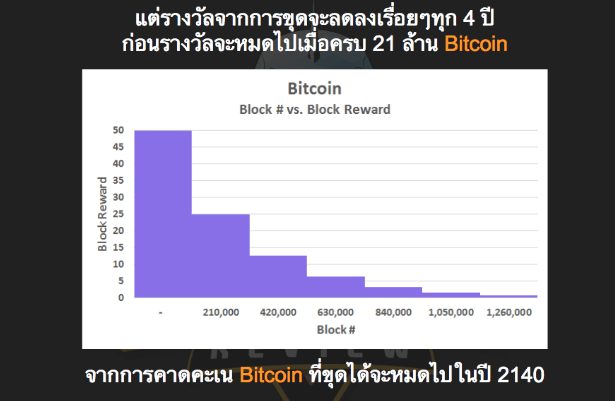 หนึ่งสิ่งที่สำคัญและควรรับทราบอย่างยิ่งคือ Supply ของ Bitcoin นั้นมีจำกัดและ Bitcoin ที่เกิดขึ้นใหม่จากการขุดนั้นจะมีการลดลงครึ่งหนึ่งทุกๆ 4 ปี โดยในปี 2009 ทุก 10 นาทีจะมี Bitcoin เกิดขึ้น 50 BTC และเมื่อผ่านไปทุกๆ 4 ปี Bitcoin จะเกิดน้อยลงครึ่งหนึ่งเป็น 25 , 12.5 ,6.25 จากการคำนวน Bitcoin ทั้งหมดจะถูกขุดขึ้นมาทั้งหมดในปี 2140 และเมื่อ Bitcoin ทั้ง 21 ล้านถูกขุดออกมาทั้งหมดแล้วการขุดก็ยังสามารถดำเนินต่อไปเพราะว่านักขุดยังได้ค่าธรรมเนียมที่ผู้โอนยินดีจ่ายให้นั่นเอง