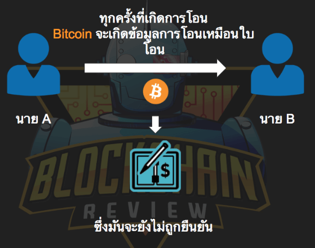 เมื่อมีการทำธุรกรรมการโอน Bitcoin เกิดขึ้นเช่นเมื่อนาย A โอนเงินให้นาย B 50 Bitcoin สิ่งที่เกิดขึ้นคือจะเกิดธุรกรรมที่บอกว่ามีโอนเงินจากนาย A ไปยังนาย B แต่ว่าธุรกรรมนี้จะเปรียบเสมือนใบโอนที่ยังไม่ถูกยืนยันแก่ระบบ