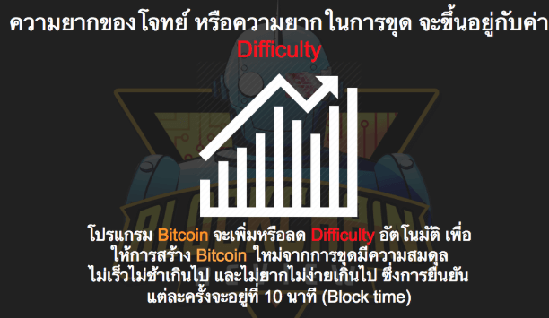 อย่างที่เราได้กล่าวไปในตอนแรกว่าโจทย์ที่นักขุดแก้ไขนั้นจะมีความยากอยู่ซื่งมันเรียกว่าค่า Difficulty โดยค่านี้จะเป็นตัวควบคุมให้ทุกๆโจทย์ถูกแก้ไขภายในเวลา 10 นาทีเพื่อให้ Bitcoin ถูกผลิตออกมาทุก 10 นาทีเพื่อให้ Supply ของ Bitcoin นั้นไม่เฟ้อหากโจทย์ถูกไขเร็วกว่า 10 นาทีเมื่อเวลาผ่านไปซักพักค่านี้จะถูกปรับให้ยากขึ้น กลับกันหากโจทย์ถูกแก้ไขช้ากว่า 10 นาทีเมื่อเวลาผ่านไปค่านี้ก็จะถูกปรับให้ง่ายขึ้น