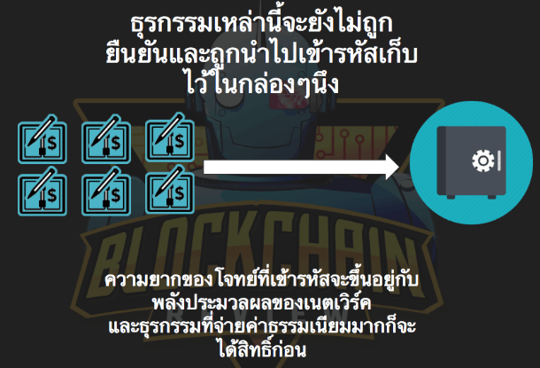 หลังจากนั้นใบโอนนี้จะถูกกระจายไปยังทั่วทุก Node ของ Bitcoin ที่เก็บสำเนาบัญชีไว้ซึ่งมันก็ไม่ได้มีใบโอนเพียงใบเดียวมันจะมีใบโอนจำนวนมากมายที่เกิดขึ้นแต่แน่นอนว่ามันก็เหมือนกับการที่ทุกคนได้ใบโอนที่ยังไม่ยืนยันเฉย ๆ ธุรกรรมนั้นยังไม่ได้เกิดขึ้นจริง ๆ ในระบบหรือแปลว่านาย B นั้นจะยังไม่ได้เงินนั่นเองแล้วเมื่อไหร่นาย B จะได้เงินหละทีนี้ปัญหามันก็เกิดขึ้นตรงนี้แล้วเพราะระบบของ Bitcoin ทำงานด้วย Node กว่า 10,000 ตัวที่ทำงานอย่างอิสระ มันไม่เหมือนระบบธนาคารที่ธนาคารจะเป็นศูนย์กลางของความน่าเชื่อถือที่จะคอยดูแลว่าธุรกรรมไหนถูกต้องหรือเปล่า ถ้าเราให้สิทธิ Node ไหนของ Bitcoin ในการเป็นผู้ตัดสินว่าธุรกรรมนั้นจะถูกต้องหรือเปล่ามัน เราจะมั่นใจได้ยังไงว่า Node ของ Bitcoin นั้นๆเชื่อถือได้