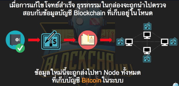 เมื่อมีนักขุดที่แก้ไขโจทย์ธุรกรรมได้ทั้งหมดที่เกิดขึ้นในเวลาหนึ่งจะถูกส่งไปให้กับ Node อื่นๆว่าธุรกรรมใดบ้างที่ถูกยืนยัน Node อื่นๆก็จะมีธุรกรรมที่ถูกยืนยันแล้วเกิดขึ้นเปรียบเสมือนสมุดบัญชีธนาคารเวลาเราไป Update Book Bank จะมีรายการโอนที่เกิดขึ้นและนาย B ก็จะได้รับเงินจากนาย A แต่