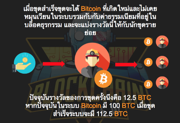 และ Bitcoin ที่หัวหน้าทีมขุดได้จะถูกแบ่งให้กับลูกทีมโดยรางวัลที่ได้นั้นก็คือ Bitcoin ที่เกิดขึ้นใหม่และค่าธรรมเนียมที่คนยินดีจ่าย โดย Bitcoin ที่เกิดขึ้นนี้จะเป็น Bitcoin ใหม่ที่ไม่เคยหมุนเวียนในระบบเช่นหากตอนนี้ระบบมี Bitcoin อยู่ 100 BTC ตอนนี้รางวัลของการขุดนั้นอยู่ที่ 12.5 BTC เมื่อขุดสำเร็จก็จะมี Bitcoin จำนวน 112.5 BTC เปรียบเสมือนกับการผลิตเงินหรือพิมพ์ธนบัตร