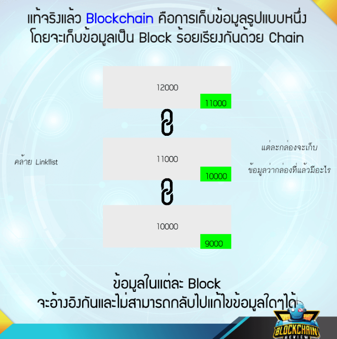 ปกติถ้าเกิดลองให้เราคิดไป สมมติว่าใน database อันนึงเราจะเก็บข้อมูลเป็นแถว ใช่มั้ยครับเป็นแถว ถ้าเกิดใครเคยเล่นโปรแกรม Excel มันจะเป็นแบบนั้นเลยเป็นแถวเป็นตารางเรียงลงมา ถ้าเกิดคนที่เรียนคอมพิวเตอร์ก็จะรู้หน่อยว่าระบบ database ที่ใช้เป็น sql เป็นยังไงนะครับ ทีนี้พอมาถึงเป็น Blockchain เขาบอกว่าเราจะเก็บข้อมูลเป็น Block และอ้างอิงกันด้วย chain เราถึงเรียกว่า Blockchain นะครับ