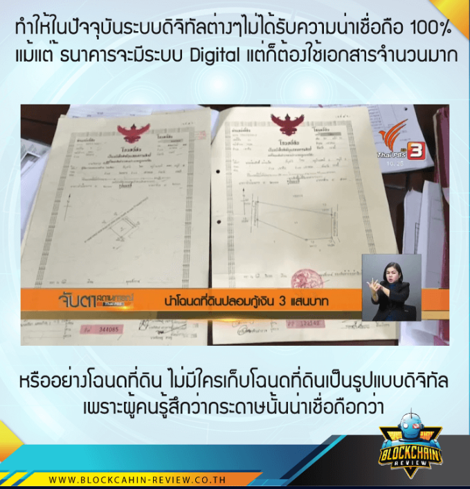 เพราะว่า Blockchain เชื่อถือได้มากกว่ากรมที่ดินนะครับ Blockchain เชื่อถือได้มากกว่าโฉนดเอกสารหนึ่งใบนะครับเพราะว่าเอกสาร 1 ใบสามารถทำหายได้ มีการปลอมแปลงได้ แล้วบางทีมีใบเดียว อย่างที่เรารู้ๆ กันว่ามันก็มีการออกโฉนดซ้ำกันบ่อยๆ นะครับ หรือถ้าเกิดว่าสมมติว่าในกรณีอื่นๆ เนี่ย เรามันสามารถทำให้เหมือนกับว่า finalcial credit อะไรบ้างอย่างที่ไม่เคยมีค่ามีค่าขึ้นมาได้