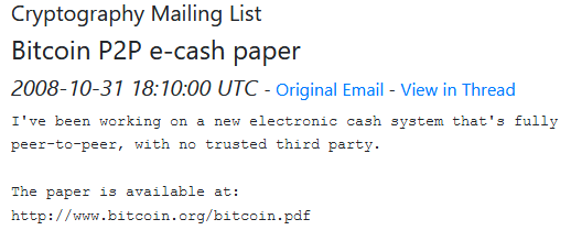 Bitcoin: A Peer-to-Peer Electronic Cash System - ถูกเผยแพร่เมื่อวันที่ 31 ต.ค. 2008 - โปรโตคอลการส่งข้อมูลแบบเพียร์ทูเพียร์ที่มีการพิสูจน์แล้วว่ามีความเป็น decentralized ที่สามารถติดตาม และตรวจสอบธุรกรรมดิจิตอลได้ ช่วยป้องกันการเกิด double-spending และเปิดให้ทุกคนสามารถตรวจสอบได้แบบเรียลไทม์