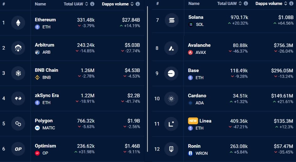ในทางตรงกันข้าม ปริมาณโวลลุ่มบน BNB Chain ในช่วงเวลาเดียวกันอยู่ที่ 4.5 พันล้านดอลลาร์ ในขณะที่ Arbitrum สะสมอีก 5 พันล้านดอลลาร์ และสิ่งที่โดดเด่นที่สุดคือ Ethereum เป็นบล็อกเชนเดียวในหกอันดับแรกที่มีปริมาณโวลลุ่มเพิ่มขึ้นในช่วงเจ็ดวันที่ผ่านมา