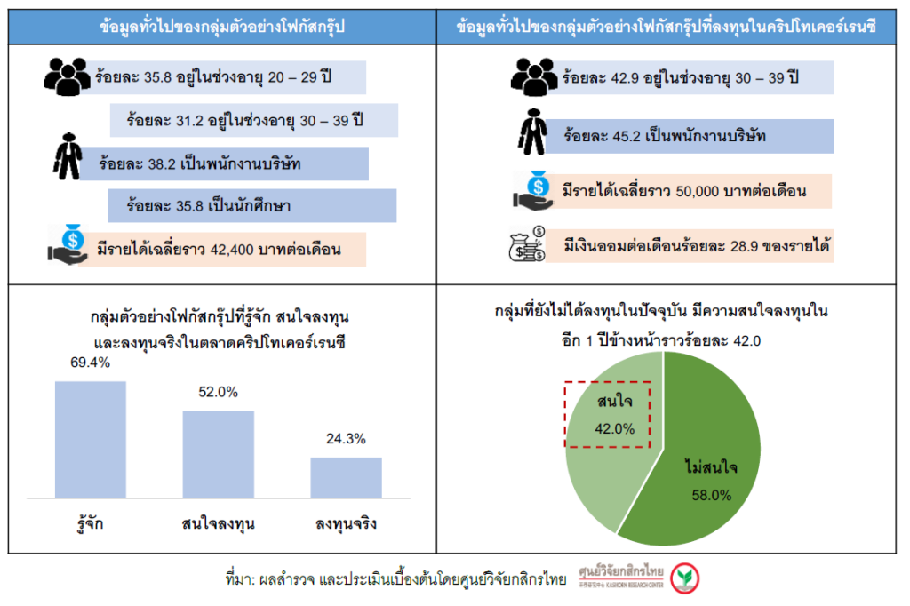 ศูนย์วิจัยกสิกรไทย ได้ดำเนินการสำรวจการลงทุนในตลาดคริปโตกับกลุ่มตัวอย่างโฟกัสกรุ๊ป ซึ่งส่วนใหญ่เป็นกลุ่มพนักงานบริษัทเอกชนที่มีรายได้สูง อาศัยอยู่ในกรุงเทพฯ และปริมณฑล