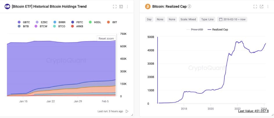 การเปิดตัวกองทุน Bitcoin ETF แห่งแรกของสหรัฐอเมริกาเมื่อเดือนที่แล้วได้เปิดการรุกเข้าสู่ทุนสถาบัน ซึ่ง Ki จาก CryptoQuant เห็นด้วยกับการคาดการณ์ตลาดล่าสุดของเขา โดยพิจารณาถึงผลกระทบของการลงทุนต่อ realized cap ของ Bitcoin