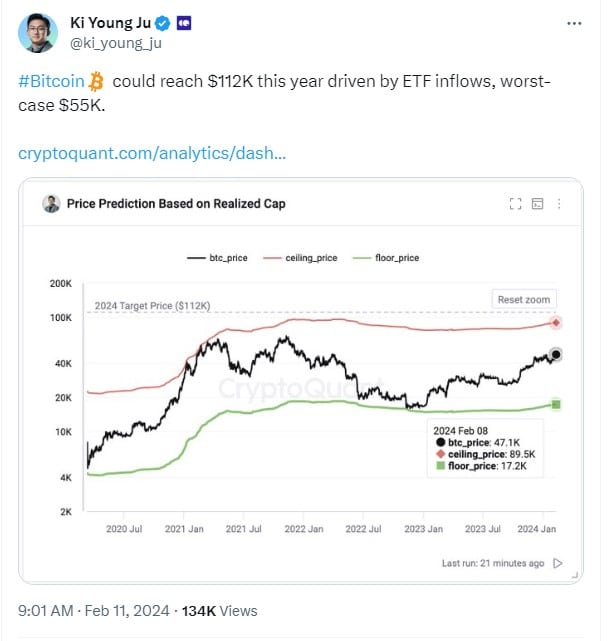 ในการวิเคราะห์ครั้งใหม่บน X (ชื่อเดิม Twitter) เมื่อวันที่ 11 กุมภาพันธ์ Ki Young Ju ซีอีโอของ CryptoQuant แพลตฟอร์มการวิเคราะห์ คาดการณ์ราคา Bitcoin ไว้ที่ 112,000 ดอลลาร์หรือ 4 ล้านบาท ต่อ Bitcoin ในปีนี้