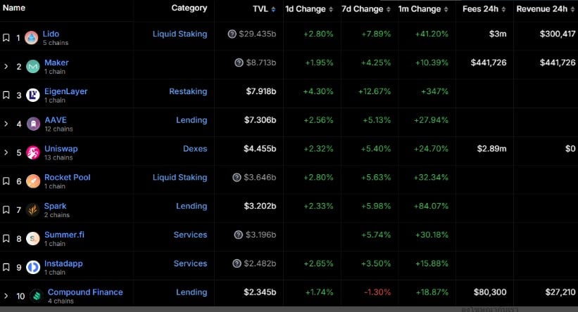 ปัจจุบัน EigenLayer เป็นโปรโตคอลที่ใหญ่เป็นอันดับสามบน Ethereum โดยมี TVL อยู่ที่ 7.91 พันล้านดอลลาร์ โดย TVL ของ EigenLayer เพิ่มขึ้น 4.30% ใน 24 ชั่วโมงและมากกว่า 347% ในเดือนที่ผ่านมา ตามข้อมูลของ DefiLlama
