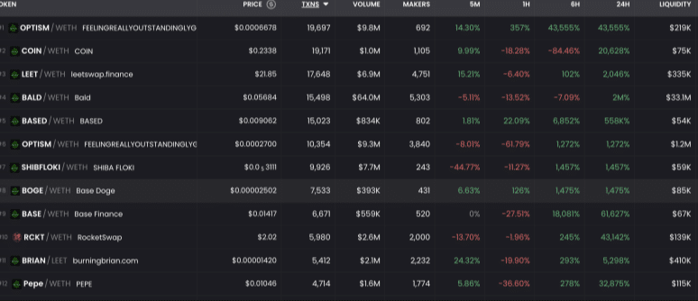 ตามรายงานของ DEX Screener Memecoins พบธุรกรรมมากกว่า 276,000 รายการในวันที่ผ่านมา โดยเหรียญ Memecoins เช่น Bald พุ่งสูงขึ้นอย่างรวดเร็วบนเครือข่าย เพิ่มขึ้นมากกว่า 20,000 เท่าในเวลาเพียง 24 ชั่วโมง
