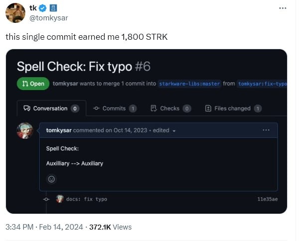 ผู้มีส่วนร่วมที่มีสิทธิ์รับ Airdrop รายหนึ่ง ซึ่งทำการตรวจสอบการสะกดแบบง่าย ๆ ก็ได้รับโทเค็น Starknet ไป 1,800 โทเค็น